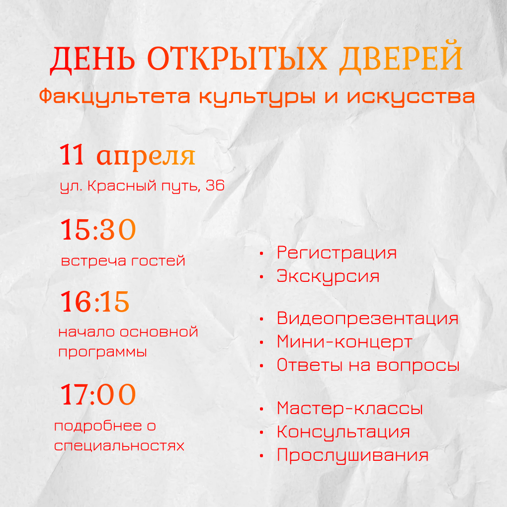 Факультет культуры и искусств открывает свои двери для всех желающих! В программе: мини-экскурсия, демонстрация видеофильма о факультете культуры и искусств, приветственное слово декана, мини-концерт студентов музыкальных направлений, презентация образовательных программ, мастер-классы и презентации по направлениям подготовки и специальностям, знакомство с заведующими кафедр и ведущими преподавателями, а также ответы на вопросы абитуриентов и их родителей.